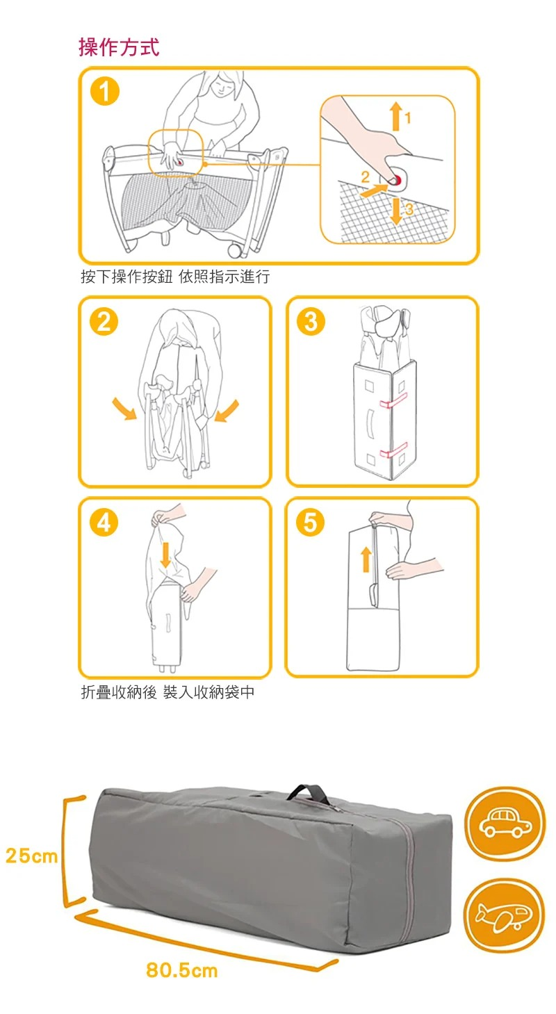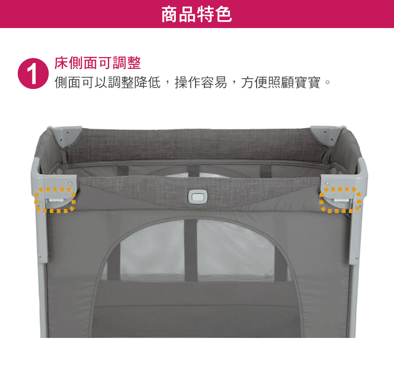 ■ 商品說明:1.床側面可以調整降低,方便照顧寶寶2.側面雙按鈕設計安全調整下降3.吊床拉鍊設計,方便打造成安全遊戲大空間4.單邊雙輪設計方便移動嬰兒床5.四邊網布設計,透氣舒適6.簡單操作按鈕收納設計7.收納後體積超小8.旅行專用收納袋,外出旅行帶著走