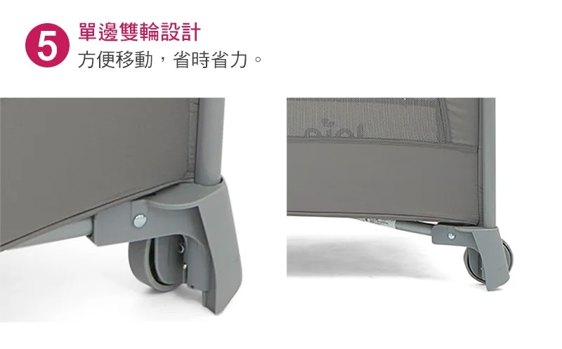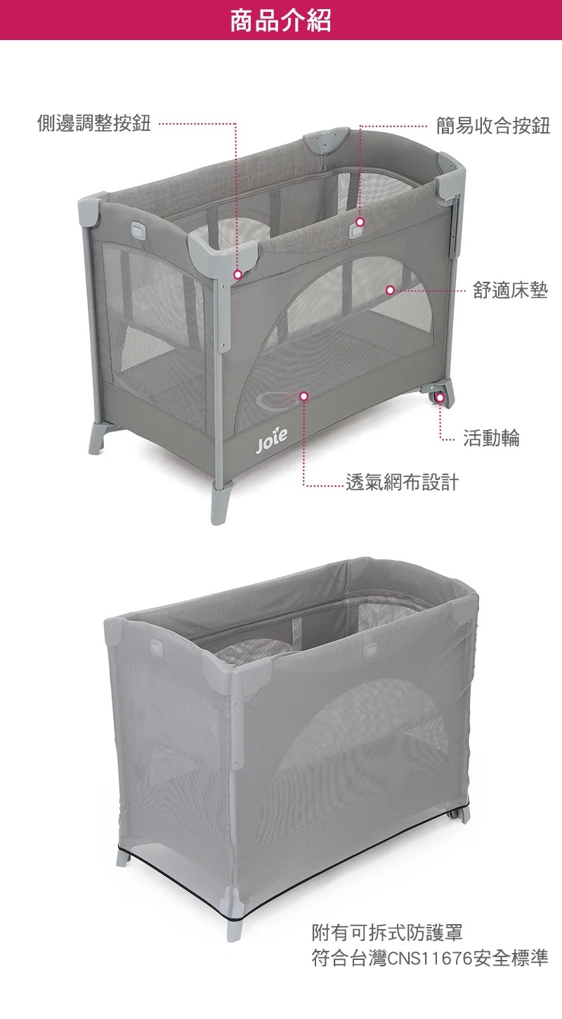 ■ 注意事項:1.正確的使用本嬰兒床可以降低寶寶傷亡的機率,請務必閱讀使用說明書。2.不得將寶寶單獨留置於嬰兒床無人看護。3.本嬰兒床如有任何損壞或零件缺失時,請勿繼續使用。4.本嬰兒床請放置在平坦地面上,不可放置在下坡或傾斜地面上。5.請勿放置玩偶等其餘會造成幼兒危險物品。6.請勿使用非JOIE原廠同尺寸床墊。7.請勿使用其他繩子吊掛玩偶或安撫物品在嬰兒床床邊。8. 適用年齡:新生兒至15kg,體重在15kg以內幼兒使用(當您的嬰兒6個月大時、或可以翻身、或會爬行時,請停止使用吊床。)